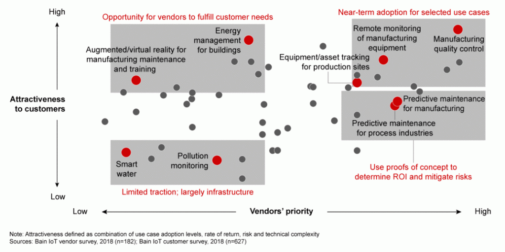 Organizations are already reaping tangible benefits. McKinsey finds that IoT is a business opportunity, not just a tech opportunity. Consumer IoT like home devices, gaming, etc. are helping deepen customer understanding, inform product design, even change business models, as McKinsey argues in their example about — a networked school backpack! While that might be a bit of a stretch, opportunities in the industry are aplenty across use cases, as Bain and Company illustrates below.